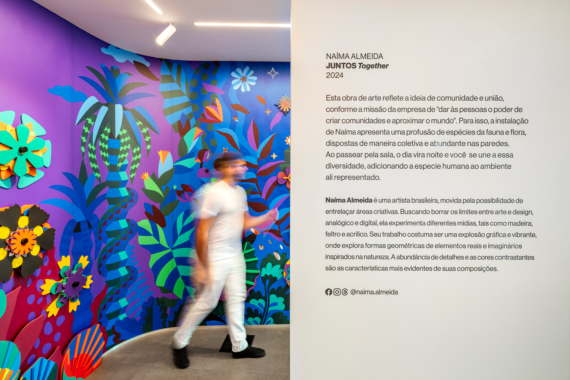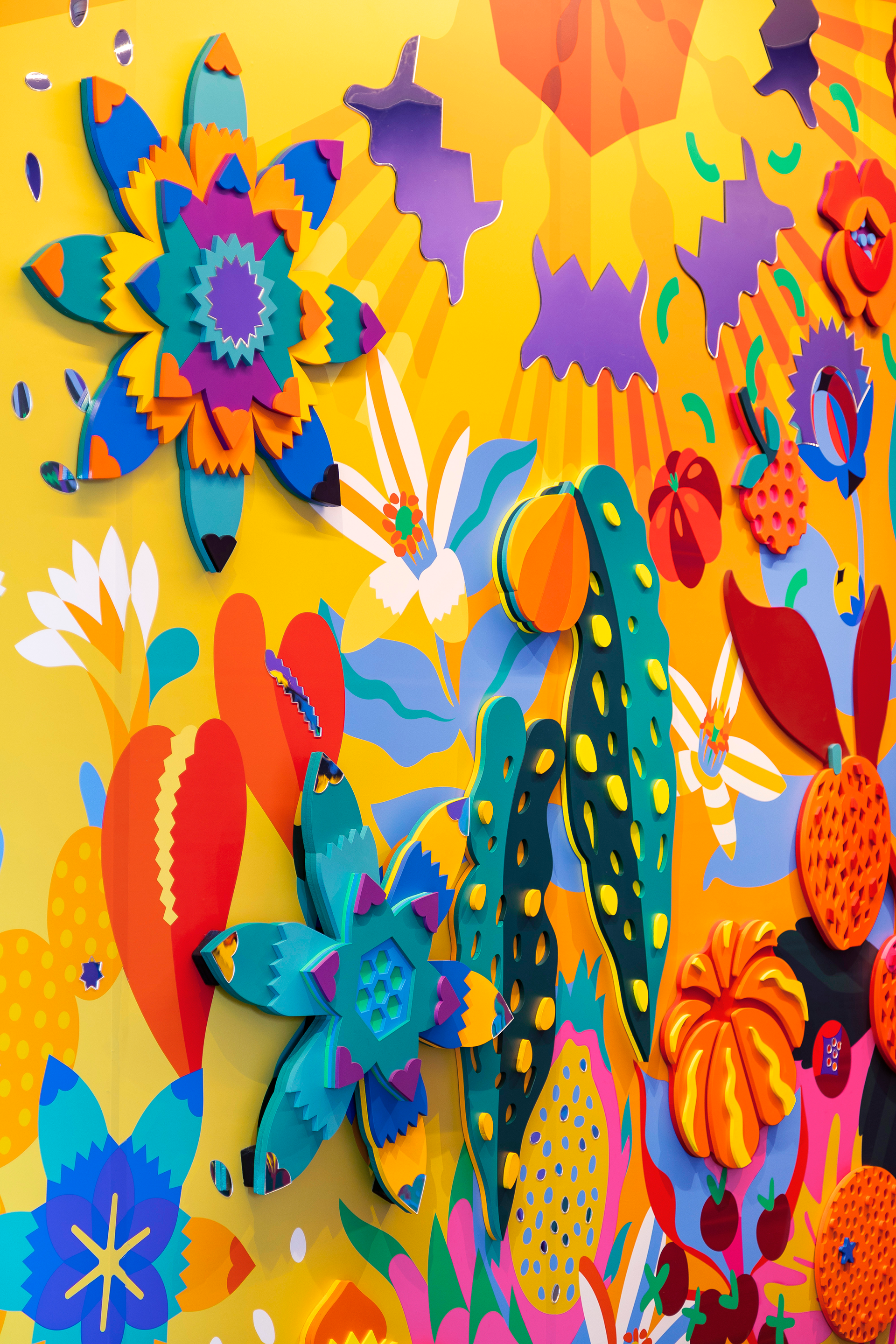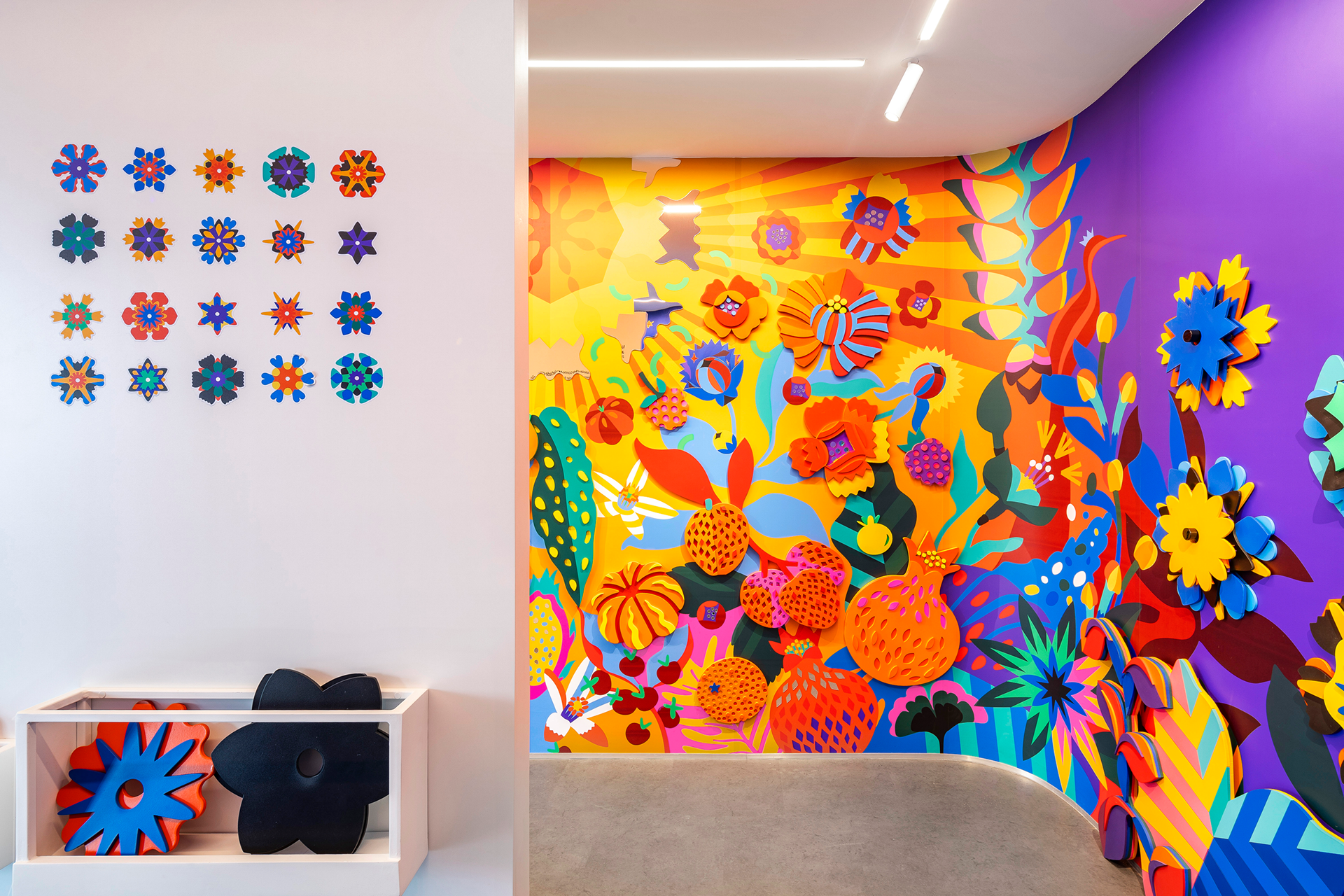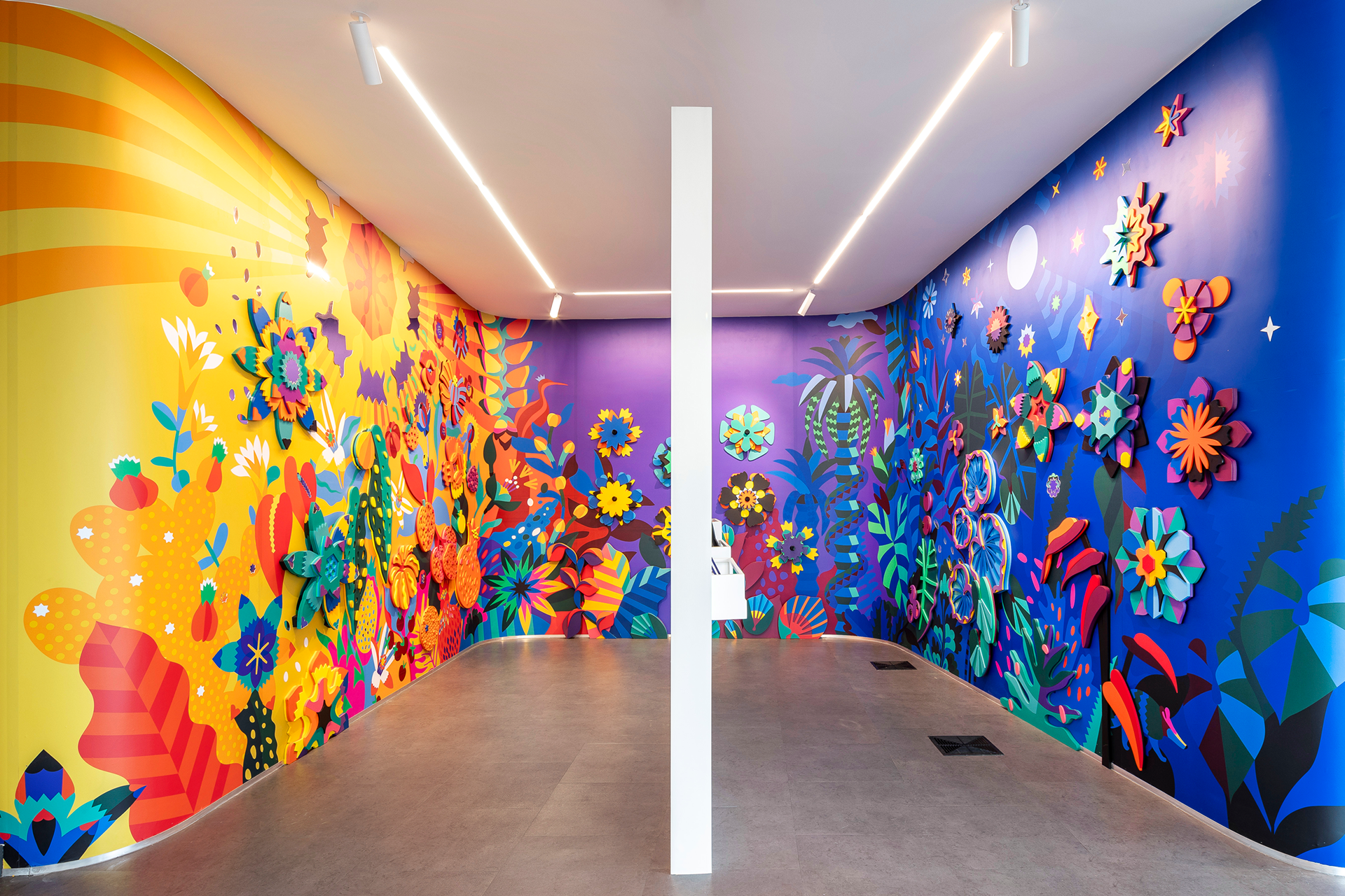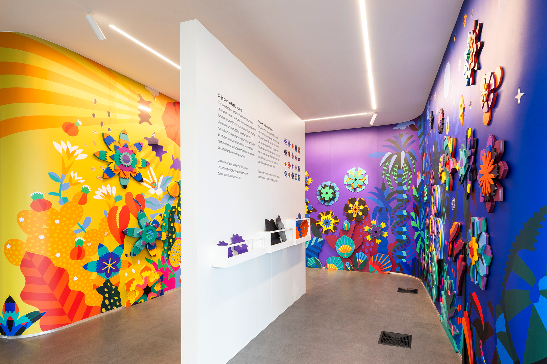 Interactive installation created for a corporate tech office, inspired by the concepts of community and collaboration. With natural shapes arranged on the walls, the project transitions between daytime and nighttime scenarios, blending illustration and three-dimensional elements. At its center, a collective garden invites visitors to create their own flowers by layering modular pieces, transforming the space with every interaction.